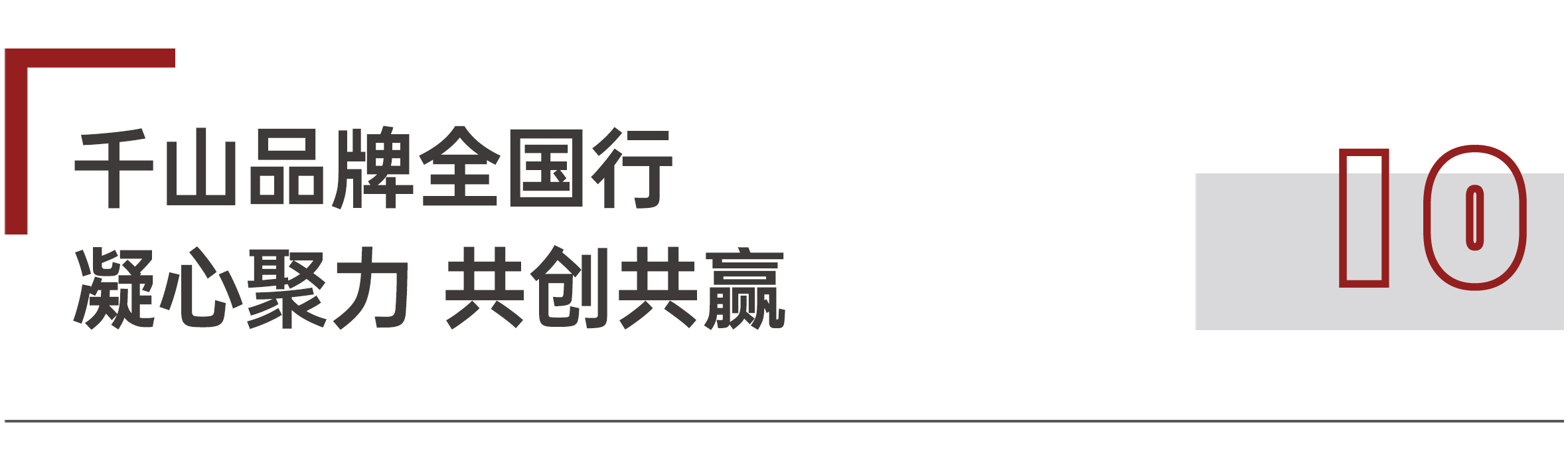 一季度,千山品牌全國(guó)行活動(dòng)相繼在河南、江蘇、山東、湖南、河北、山西,6省13地市成功舉行,累計(jì)綁定銷售額超8000萬(wàn),掀起了千山板材的品牌傳播熱潮。接下來(lái),千山品牌全國(guó)行還將在全國(guó)各地陸續(xù)舉行,歡迎更多的合作伙伴蒞臨現(xiàn)場(chǎng),參觀交流。