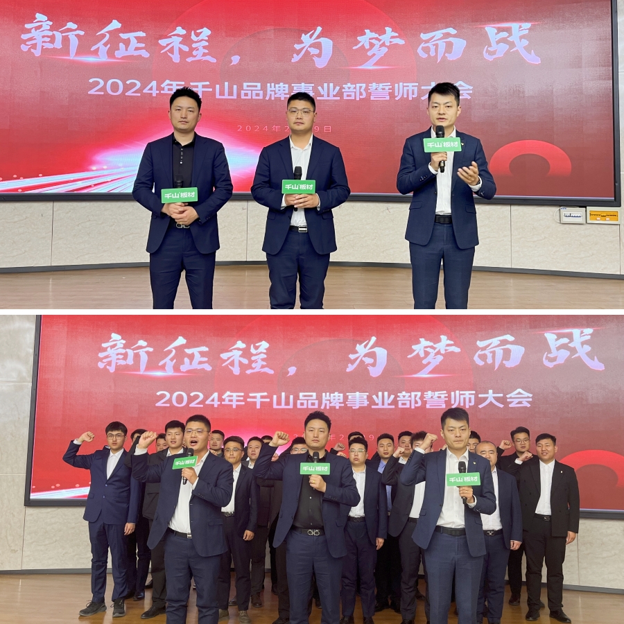 2024年2月,“新征程 為夢而戰(zhàn)”2024千山品牌事業(yè)部誓師大會高燃啟動。全體營銷精英集結(jié)一堂,簽署目標(biāo)軍令狀,燃情宣誓,吹響全面決勝的集結(jié)號,奮力沖刺全年銷售目標(biāo)。