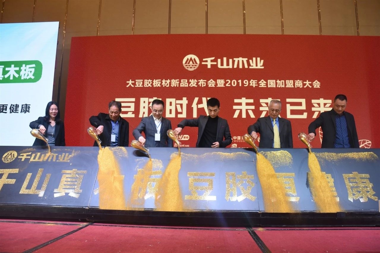2019年3月21日,在板材之都山東臨沂舉行了“豆膠時代·未來已來”新品發(fā)布會暨2019年全國加盟商大會。千山大豆膠板材成功上市,意味著板材行業(yè)由脲醛膠E0級時代跨入植物豆膠新時代!