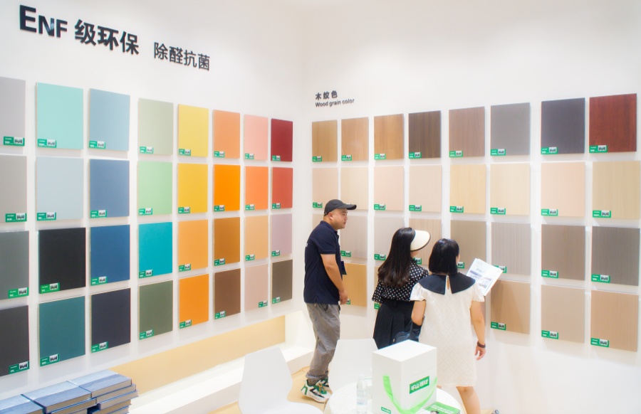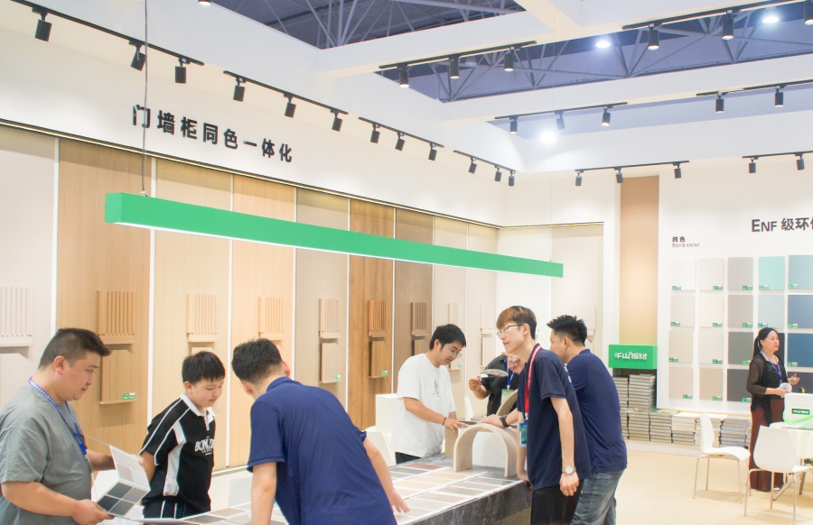 千山板材展館以6大系列花色矩陣呈現(xiàn),分為6大展區(qū):木紋系列32款,純色系列41款,布紋石紋系列8款,高定系列10款,數(shù)碼系列24款,門板系列12款,127款潮流花色詮釋千山板材對(duì)于時(shí)尚家居的探索和引領(lǐng)。