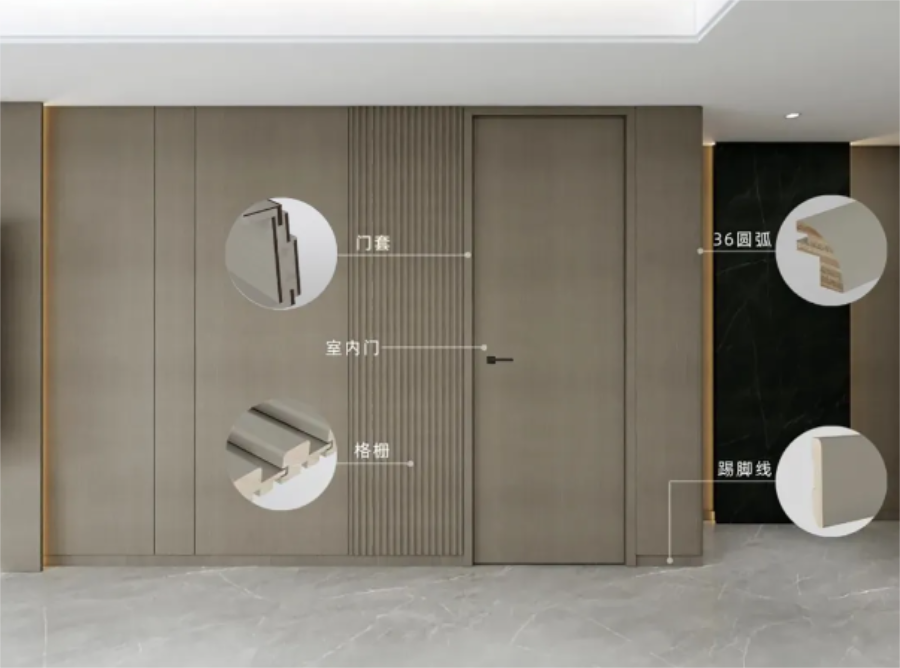 門墻柜系統涵蓋板材、室內門、圓弧、實木格柵、埡口、門套線、踢腳線,打通23款花色,材質、色彩統一,實現門墻柜全屋同色一體。