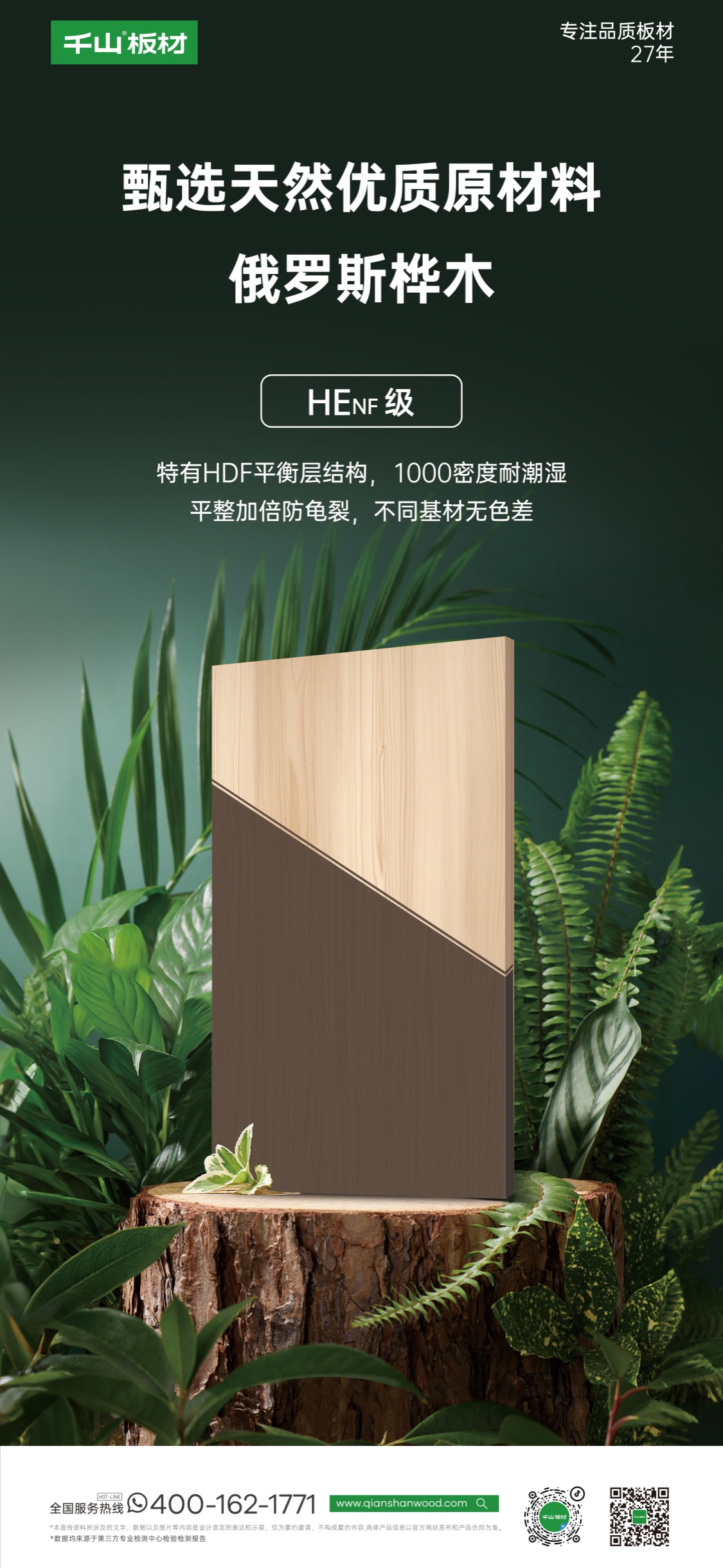 因常年處于日照時間長、水分攝入量少的寒冷地帶,使樺木的密度比較高,并且具有天然抗蟲性能,堅硬的質地在抗壓力、抗腐蝕力方面擁有極強的特性,造就了俄羅斯樺木板更強的耐寒性能。俄羅斯樺木板在抗變形、抗裂性方面同樣具有出色表現,適用于多種室內環境,無論是溫濕度變化頻繁的廚房,還是自然舒適感的臥室。俄羅斯樺木板經過原木養生、板條養生、板芯養生,再經過全烘干工序,恒定含水率使板材性能更穩定,不必擔心濕熱環境變化而導致變形。實木芯采用全指接結構,無縫拼接更加密實,特有HDF平衡層,1000密度耐潮濕,平整度加倍,防止家具龜裂、變形,保持家具的完美形態。俄羅斯樺木板采用無醛膠,環保等級通過國標ENF級和F☆☆☆☆雙檢測,并達HEnf采暖級環保標準,凈醛、抗菌、抗病毒三效合一,環保健康體驗更勝一籌。相比新國標甲醛釋放量,HEnf級板材在30度高溫檢測中甲醛釋放量更少,也更適合使用在熱環境中。飾面采用德國哈特曼油墨印刷,北人高端印刷機、益維高浸漬線、世界領先壓貼設備溫康納強力加持,造就耐磨耐刮、持久抗褪色、防水防潮的超強飾面。潮派木紋系列、經典純色系列、輕奢石紋系列、時尚數碼系列、主流PET系列,百余款潮流花色可選,隨心定制,可滿足不同的家裝風格需求。外在展現精致形態,內在錘煉核心品質。俄羅斯樺木與千山精工飾面工藝相結合,呈現花色與原木的完美同步。千山板材俄羅斯樺木板全國上新,歡迎品鑒!
